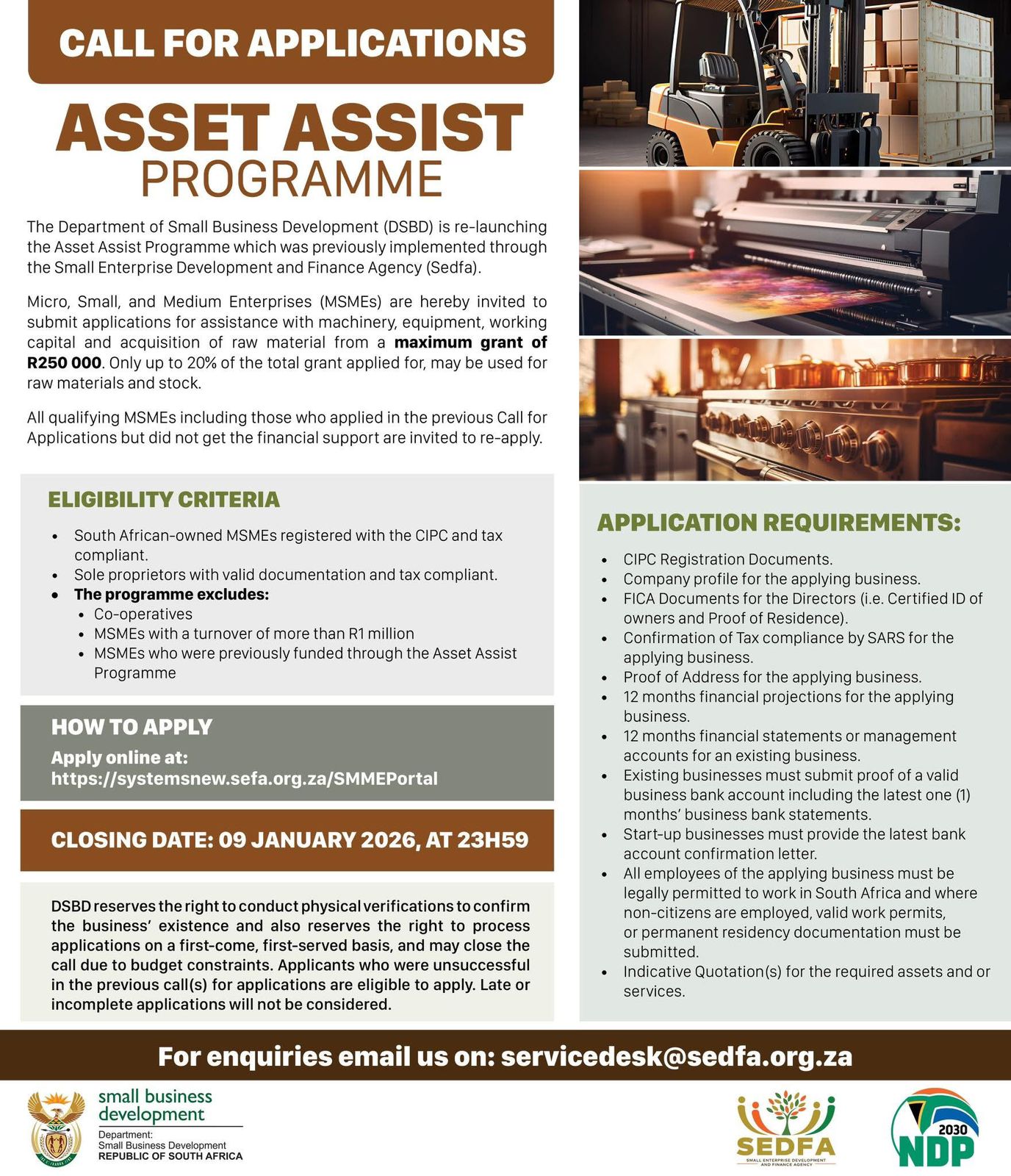 Micro, Small and Medium Enterprises (MSME’s) are hereby invited to submit applications for assistance with machinery, equipment, working capital and acquisition of raw material.