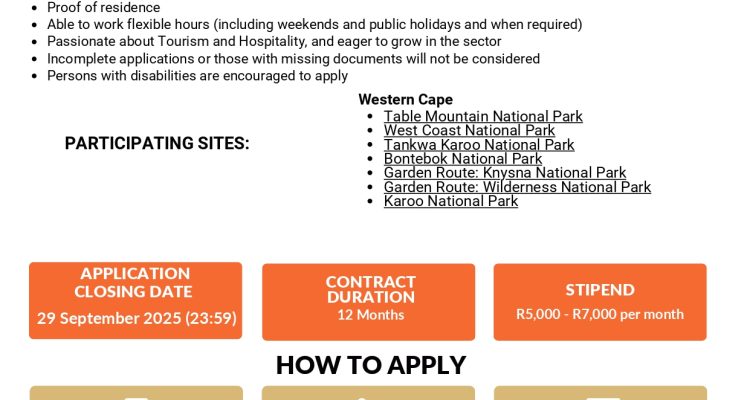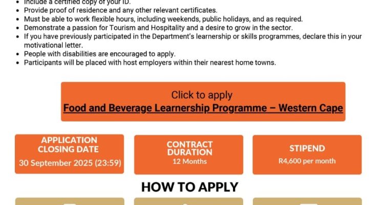 Tirzah September 26, 2025 0 Comments Food & Beverage Learnership Programme Are you passionate about Tourism and the Environment, look no further, then this is for you! Read More