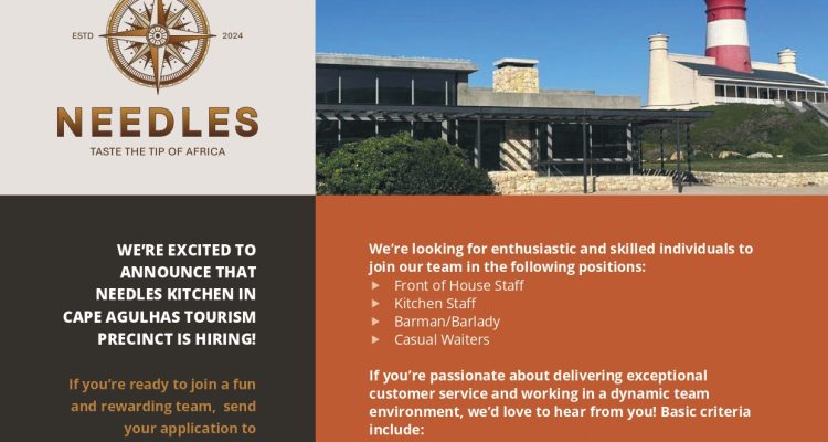 Tirzah December 3, 2025 0 Comments Needles Restaurant is Hiring! Needles Kitchen, located in the Cape Agulhas Tourism Precinct, is excited to announce that we’re recruiting! Read More