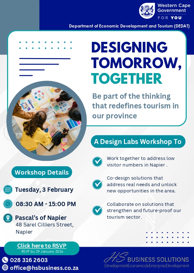 The Western Cape Government, Department of Economic Development and Tourism (DEDAT) has contracted HS Business Solutions, a highly reputable consultancy, to run a Design Lab Workshop to determine ways to improve tourism in Napier. A survey was done in November, and we are delighted that Napier was chosen as a pilot project.