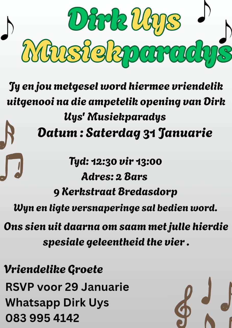 Kom geniet die dag met ons by die amptelike opening van Dirk Uys Musiekparadys! Wyn en ligte versnaperinge sal bedien word. RSVP voor 29 Januarie 2026 by 083 995 4142 …