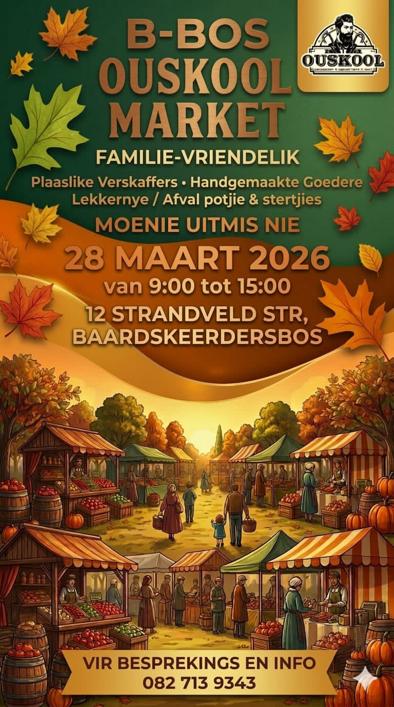 Kom koop lekker naweek kos by ons Herfsbasaar! Ons het pannekoek, jaffels, hoenderpastei, koffie, tee en nog vele meer om van te kies en keur!