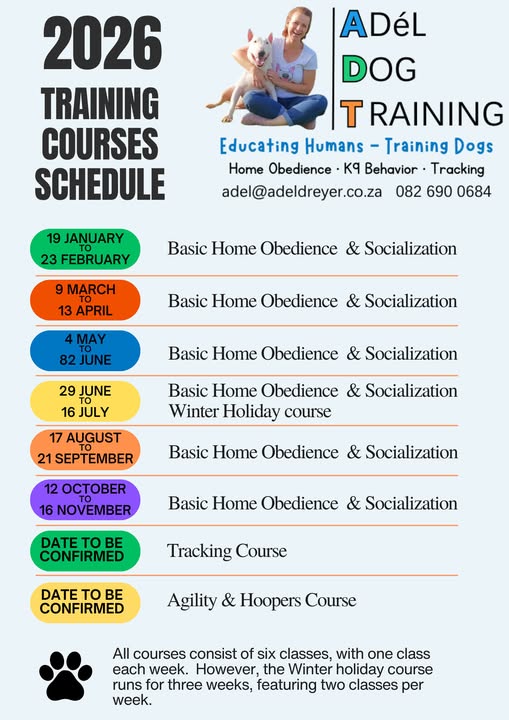2026 Home Obedience, K9 Behavior & Tracking Courses Basic Home Obedience & Socialization For more information contact Adel @ 082 690 0684 OR adel@adeldreyer.co.za |