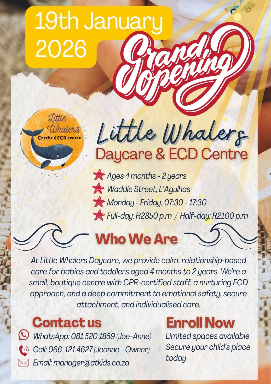 Ages 4 months - 2 years Monday - Friday, 07h30-17h30 Full day R2850pm Half day R2100 pm Limited spaces available. Secure your child's place today! For more information contact us on 081 520 1859 (Joe-Anne) 066 121 4627 (Jeanne - Owner) manager@atkids.co.za