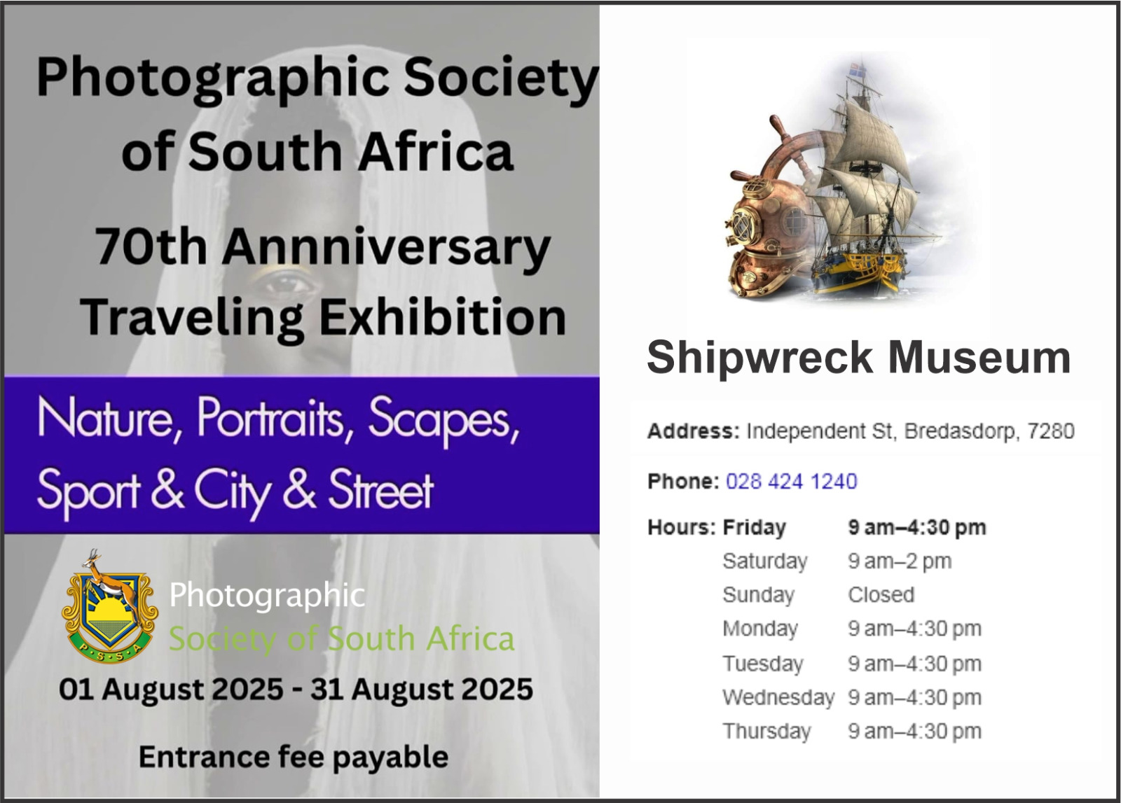 Exploring Life Through the Lens: Nature, Portraits, Scapes, Sport & City Streets This collection captures the diverse beauty and rhythm of life through five distinct yet interconnected themes. The PSSA 70th Anniversary Travelling Exhibition will be on display in the Bredasdorp Shipwreck museum for the duration of the month of August. Entrance fee payable |