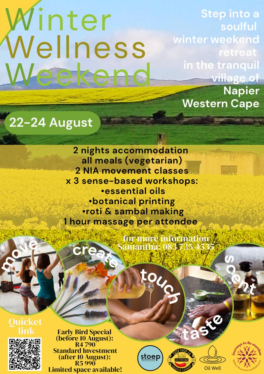 Step into a Soulful winter weekend retreat in the tranquil village of Napier! 2 nights accommodation all meals (vegetarian) 2 NIA movement classes 3 sense-based workshops: essential oils botanical printing roti & sambal making 1 hour massage per attendee Early Bird Special (before 10 August: R4790) Standard Investment (after 10 August R5990) Limited space available! …
