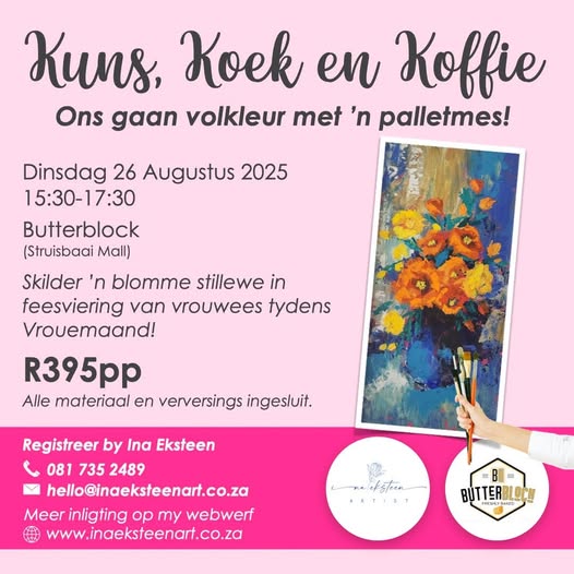 Skilder ‘n blomme stillewe in feesviering van vrouwees tydens Vrouemaand!. Alle materiaal en verversings ingesluit. Registreer by Ina Eksteen 081 735 2489 hello@inaeksteenart.co.za Meer inligting op die webwerf www.inaeksteenart.co.za