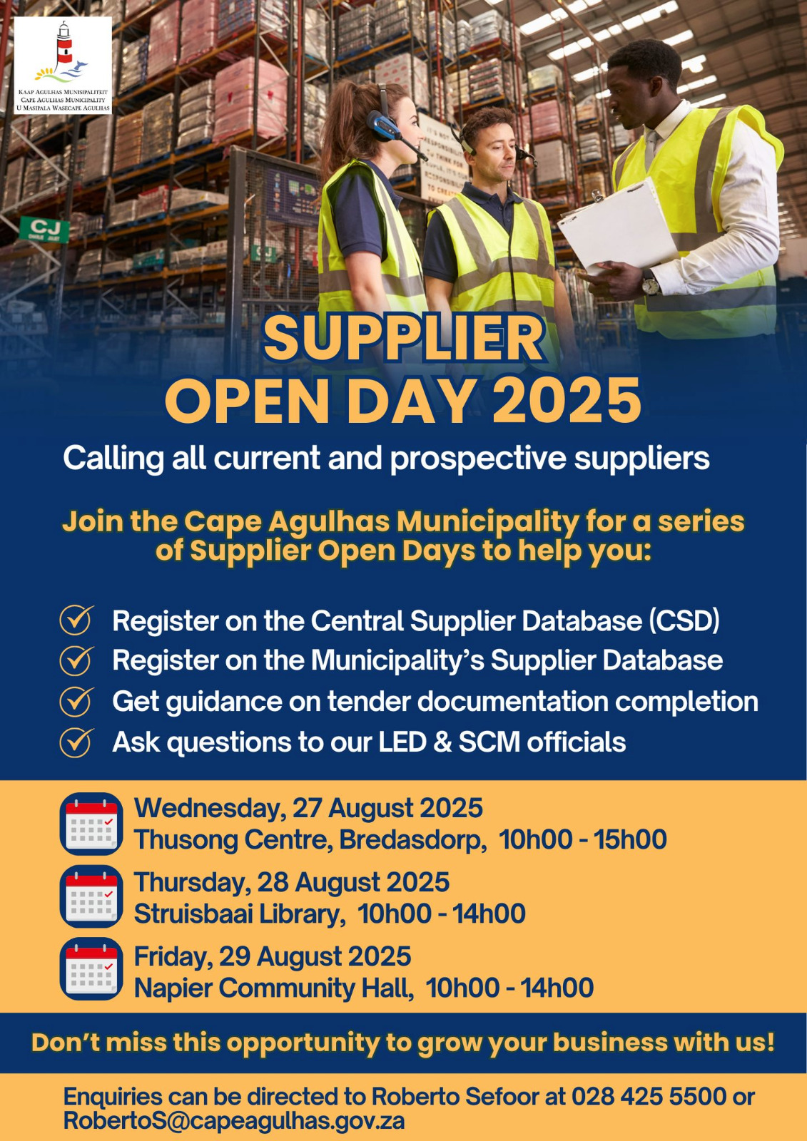 Join the Cape Agulhas Municipality for a series of Supplier Open Days, where we’ll offer guidance, answer your questions, assist with database registration, and support you in completing the necessary documentation. Enquiries can be directed to Roberto Sefoor at 028 425 5500 or RobertoS@capeagulhas.gov.za