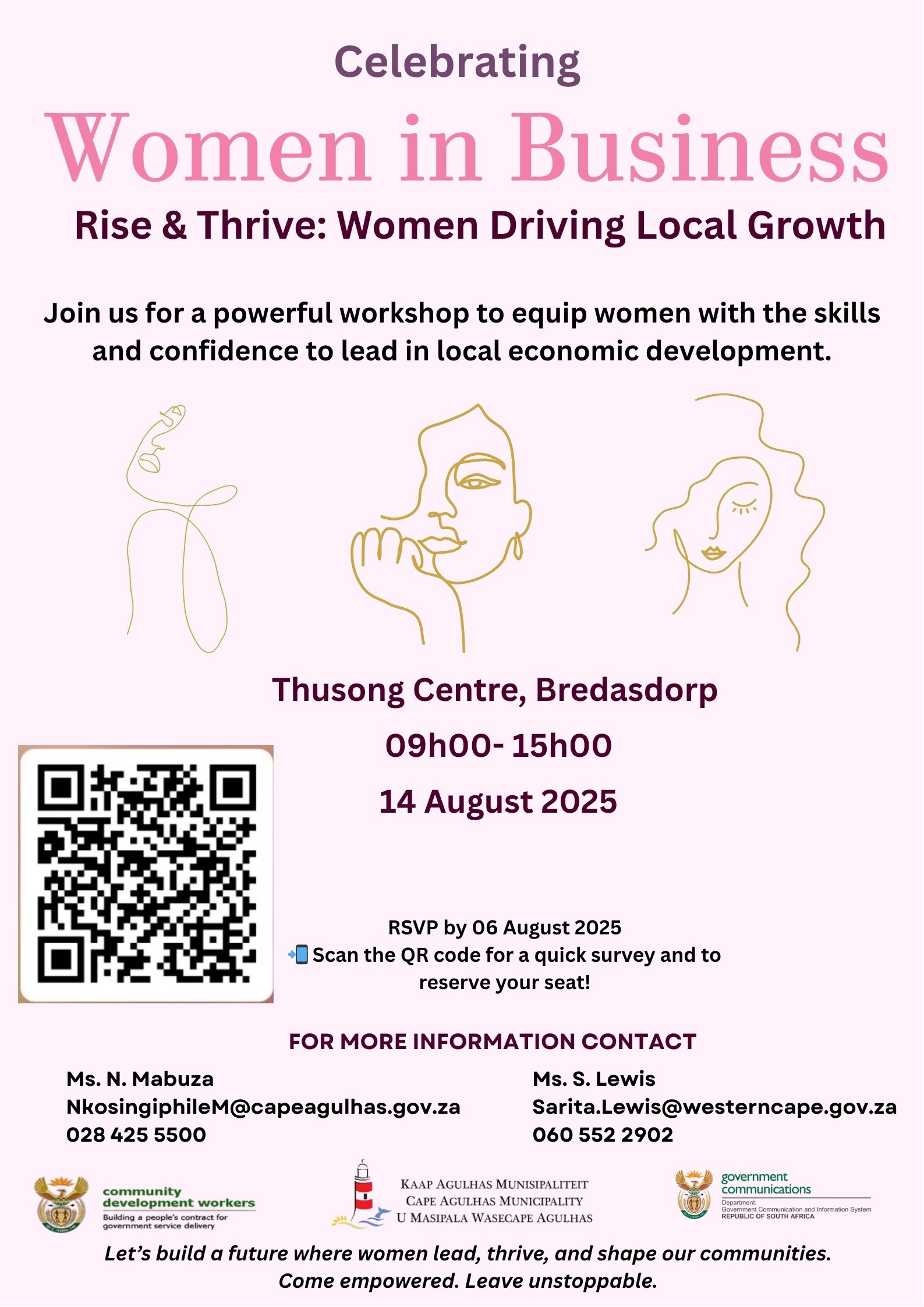 Rise & Thrive: Women Driving Local Growth RSVP by 06 August 2025 For more information contact Ms.N.Mabuza NkosingiphileM@capeagulhas.gov.za 028 425 5500 OR Ms.S.Lewis Sarita.Lewis@westerncape.gov.za 060 552 2902 |
