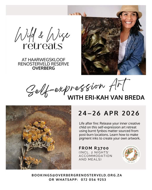 Self-expression Art with Eri-Kah van Breda Includes 2 nights accommodation and meals Contact us at bookings@overbergrenosterveld.org.za or whatsapp 072 056 9253