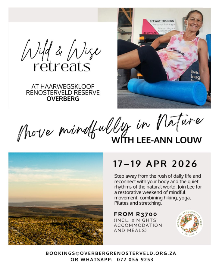 Move mindfully in Nature with Lee-Ann Louw Includes 2 nights accommodation and meals Contact us at bookings@overbergrenosterveld.org.za or whatsapp 072 056 9253