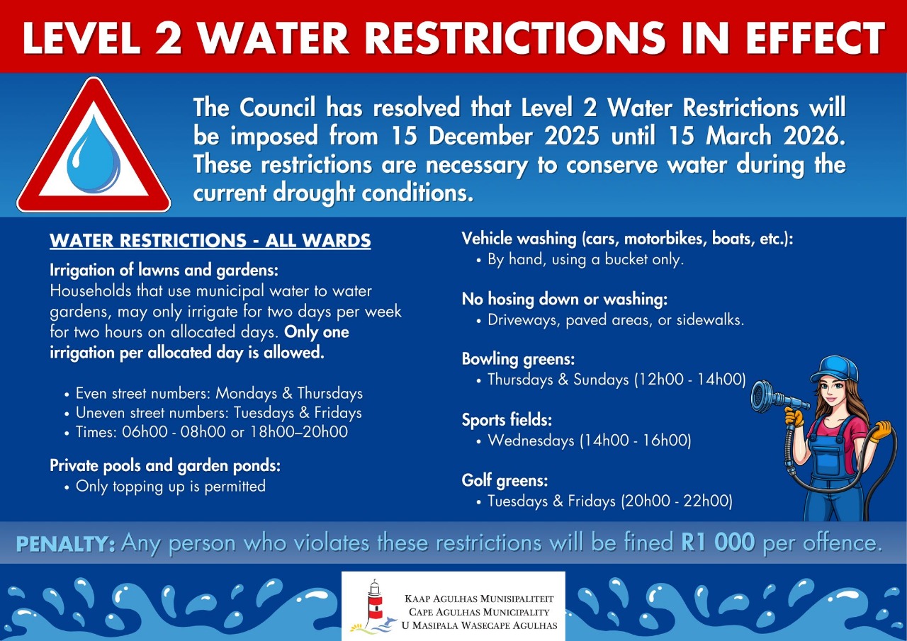 The Council has decided to introduce Level 2 Water Restrictions from 15 December 2025 through 15 March 2026. These measures are being implemented to help conserve water amid ongoing drought conditions.
