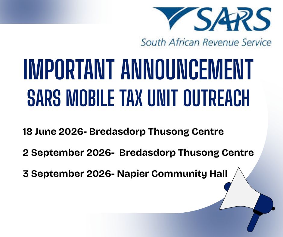 Please note that SARS will be visiting Bredasdorp and Napier on the following dates:
