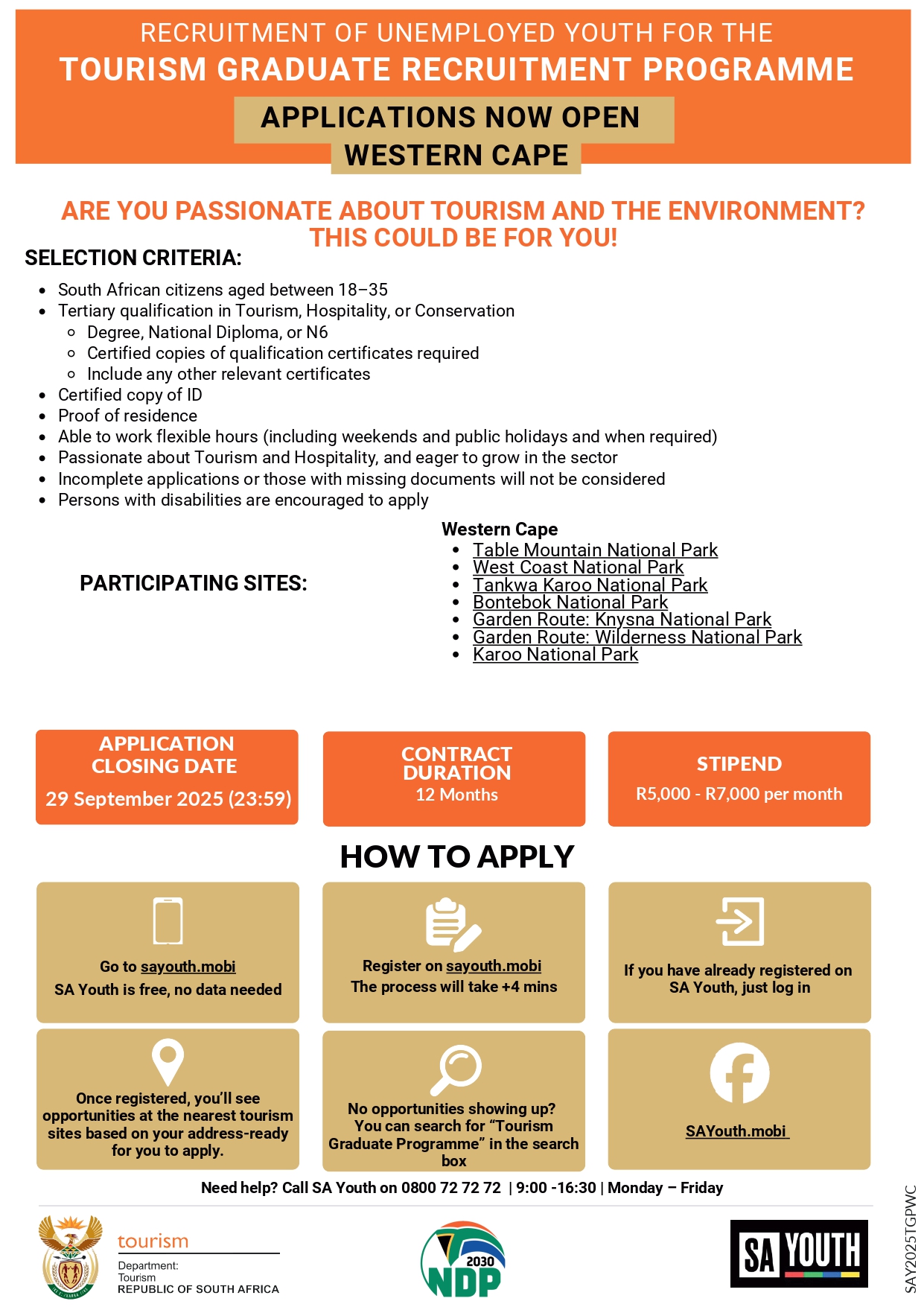 Tirzah September 26, 2025 0 Comments Tourism Graduate Recruitment Programme Please find attached the Tourism Graduate Recruitment Programme currently available in the Western Cape. Share This Post facebook twitter linkedin pinterest Post navigation Prev Food & Beverage Learnership Programme Next Oestyd Brand-Risiko