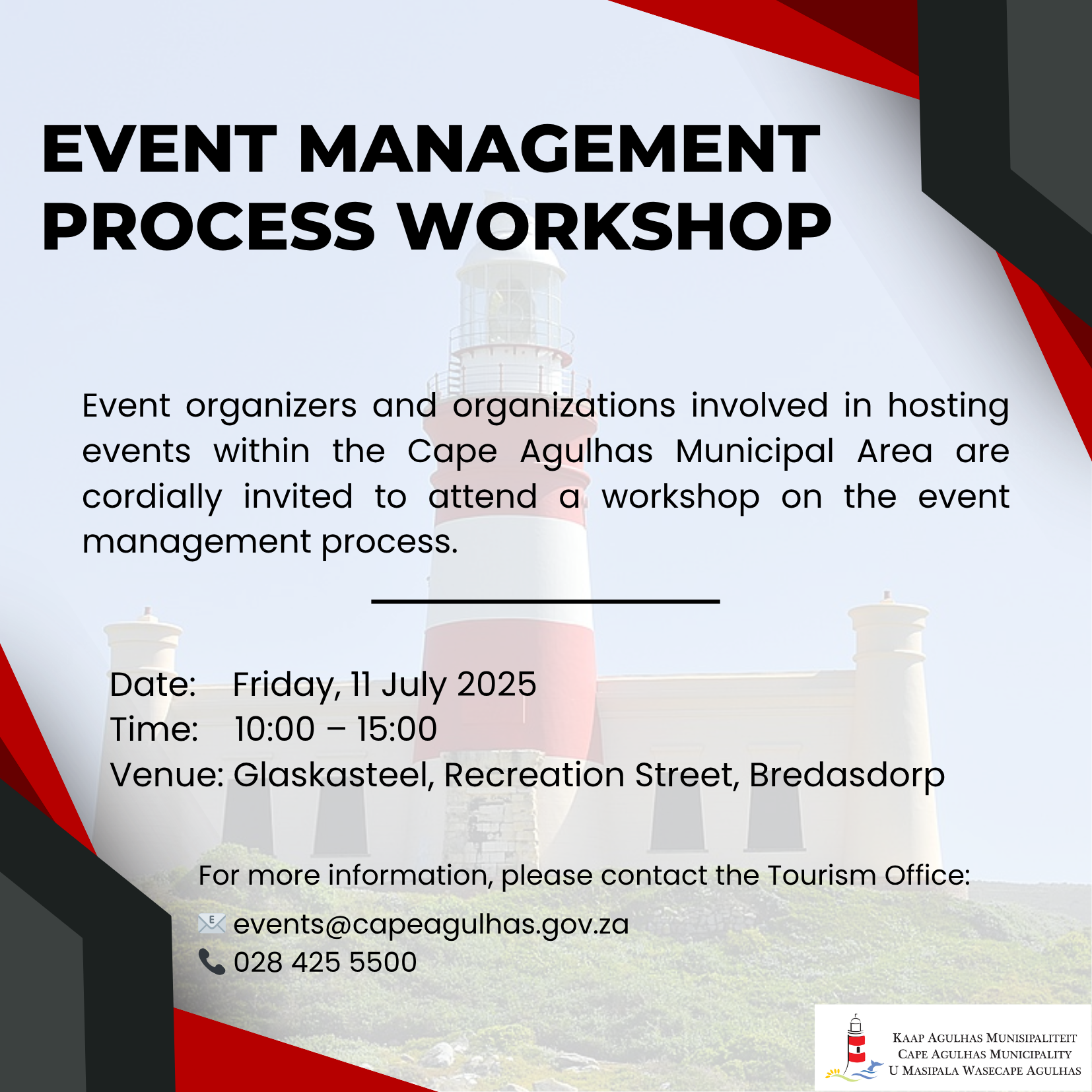 Following the recent adoption of the Cape Agulhas Municipality Event Policy, we would like to invite all event organizers and organizations involved in hosting events within the municipal area to attend a workshop on the Event Management Process.